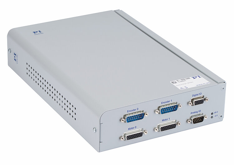ACS driver module for operation of positioners with different motor and encoder types, can be configured for a variety of applications. 2 axes, 5 A continuous current per axis possible. 2 motor brakes via PWM brake driver, reduced heat generation by the motor brake. Motion profiles are generated by an external motion controller, e.g., G-910.RC02, and received via EtherCAT. The motion controller must be ordered separately.