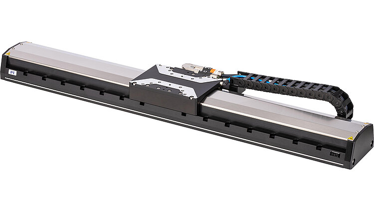 High-load linear stage; ironless 3-phase linear motor; 508 mm travel range; 400 N load capacity; 2000 mm/s maximum velocity; absolute linear encoder, 1 nm sensor resolution, EnDat 2.2; drag chain