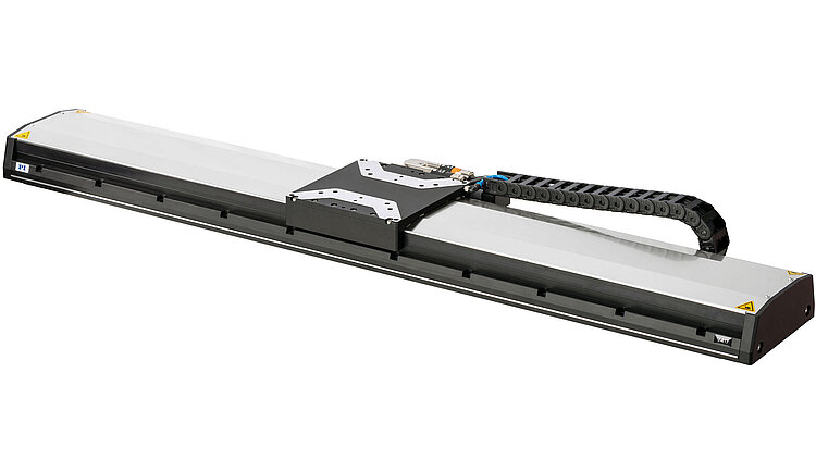 High-load linear stage; ironless 3-phase linear motor to 325 V; 204 mm travel range; 450 N load capacity; 2000 mm/s maximum velocity; incremental linear encoder, 20 µm signal period, sin/cos, 1 V peak-peak; drag chain