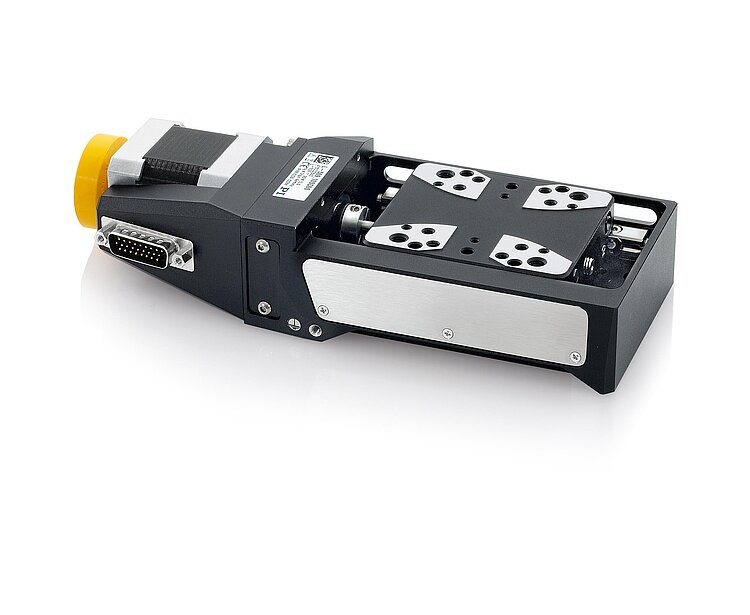 Precision linear stage; DC motor; 26 mm travel range; 100 N load capacity; 50 mm/s maximum velocity; ball screw; incremental rotary encoder, A/B quadrature, RS-422