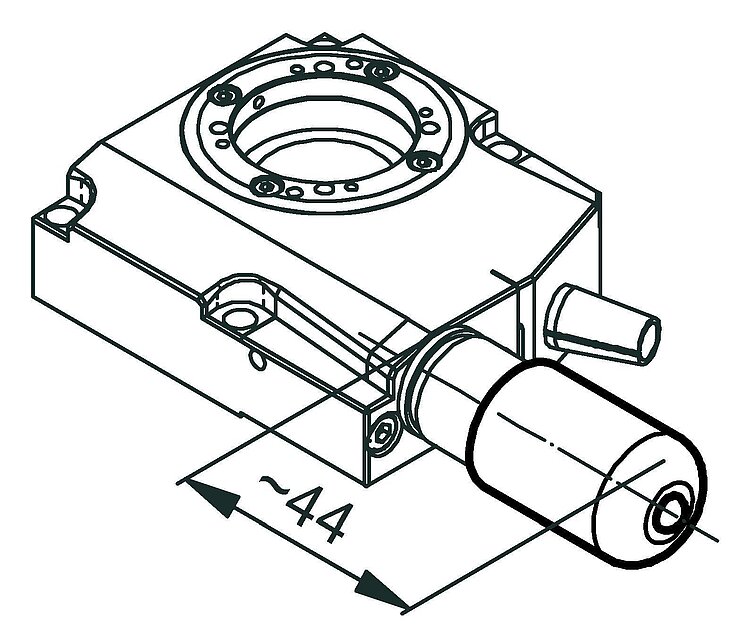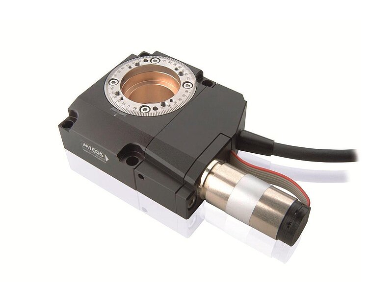 Compact rotation stage; DC gear motor; 360° rotational angle; 20 N load capacity; 7 °/s maximum angular velocity; incremental rotary encoder, 2048 cts./rev. sensor resolution, A/B quadrature, RS-422