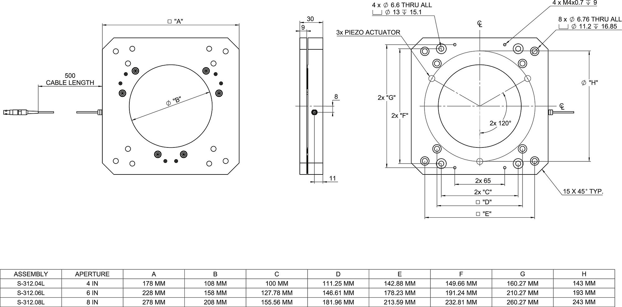 Phase shifter for optics, with tip/tilt error correction; 15 µm travel range (open loop); clear aperture, Ø 311 mm; bare wire strands; 0.5 m cable length