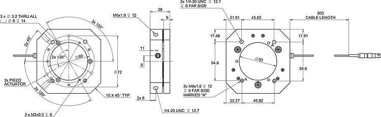 Phase shifter for optics, with tip/tilt error correction; 15 µm travel range (open loop); clear aperture, Ø 53 mm; bare wire strands; 0.5 m cable length
