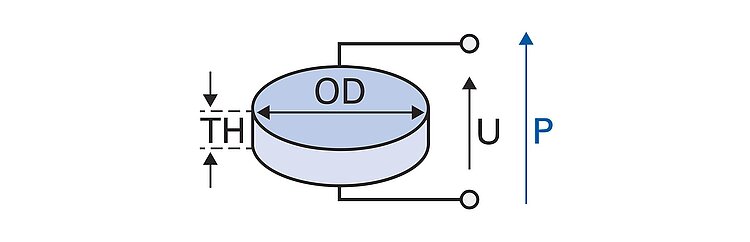 Piezoelectric disk, outside diameter (OD) = 10 mm × thickness (TH) = 0.5 mm, piezo material PIC255, electrode Ag screen printed