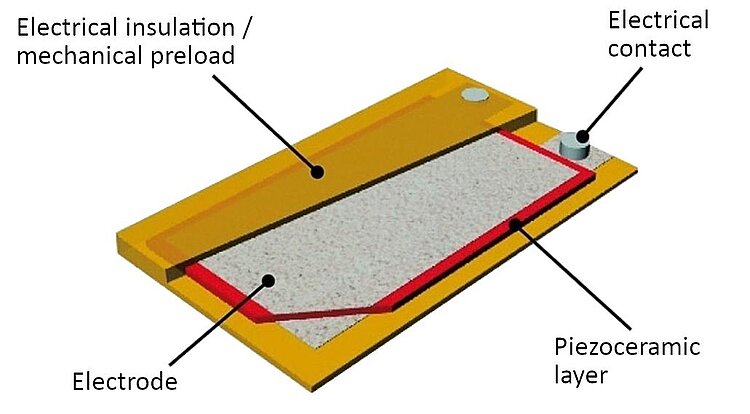 Laminated structure consisting of a piezoceramic plate, electrodes and polymer materials. Manufactured with bubble-free injection method. The polymer coating simultaneously serves as electrical insulation and as mechanical preload, which makes the DuraAct bendable.