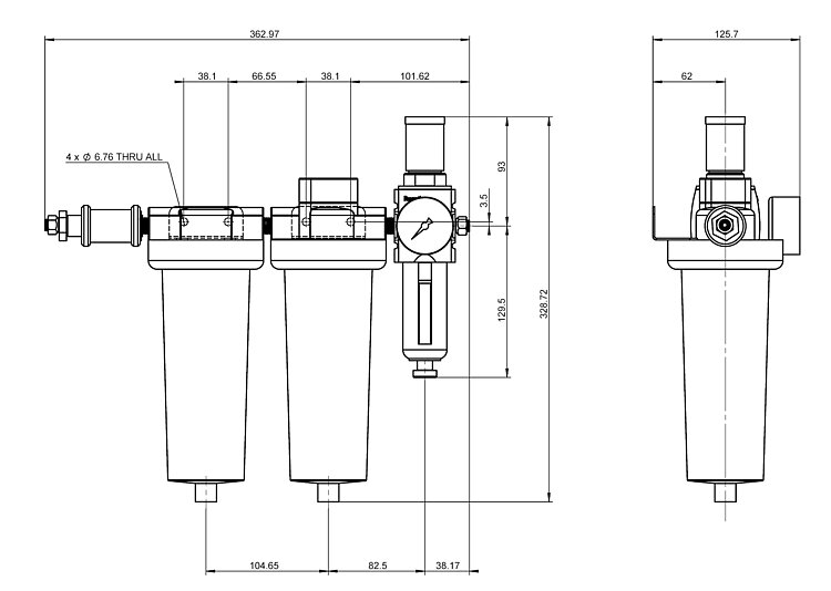 - Cleans and filters the compressed air supply, controls the supply pressure